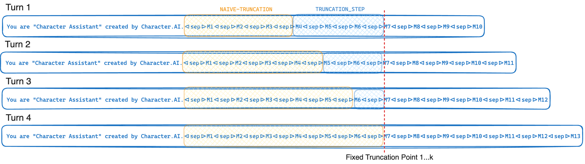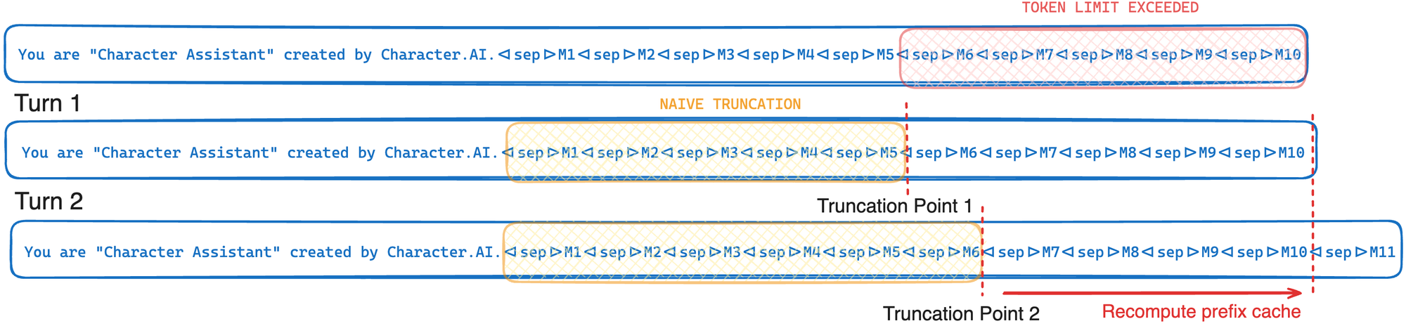 Consider the following inter-turn example where M1…M10 are current messages in a given chat. If we naively truncate to just below the token limit our truncation point shifts every turn, leaving only a small portion of the prefix to be retrieved from the cache, resulting in significant recomputation costs.